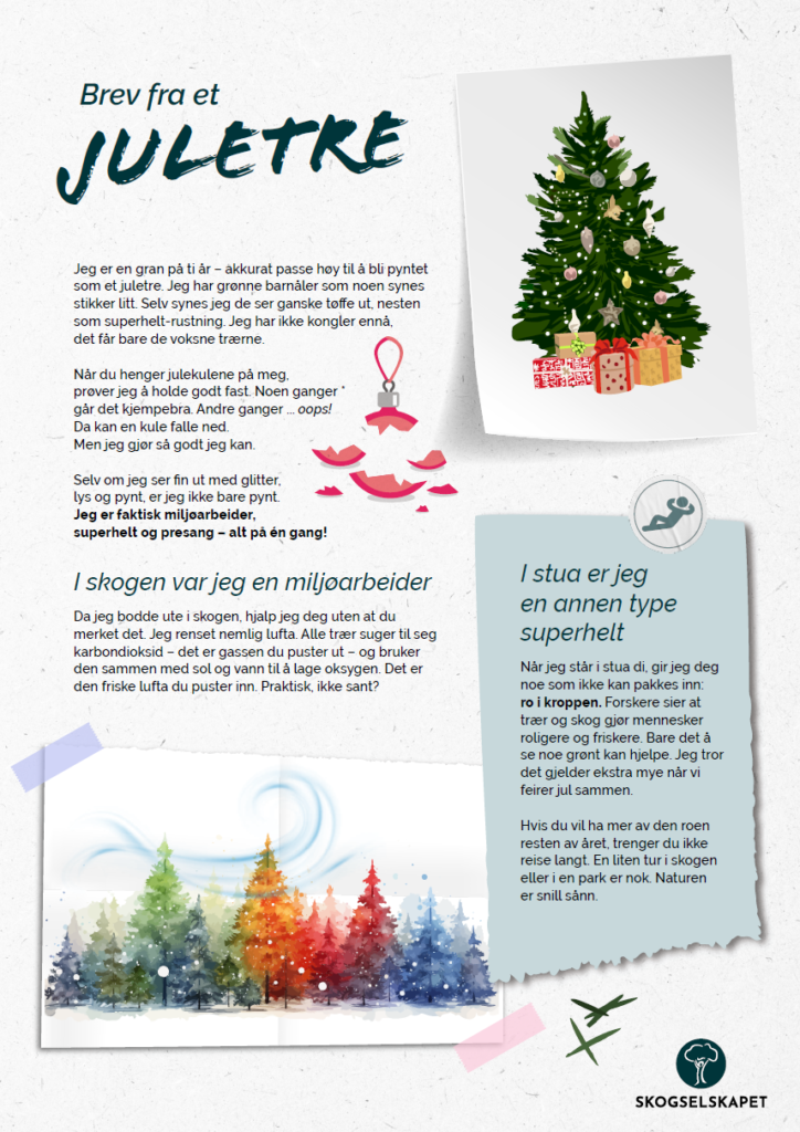 Juletreet er et viktig symbol på julen for mange. Men har du tenkt på hvor mye av det som omgir oss i julen, faktisk har stoff fra tre i seg? I leseteksten «Brev fra et juletre» lærer du mer om dette, og hvilke andre oppgaver juletreet har.
